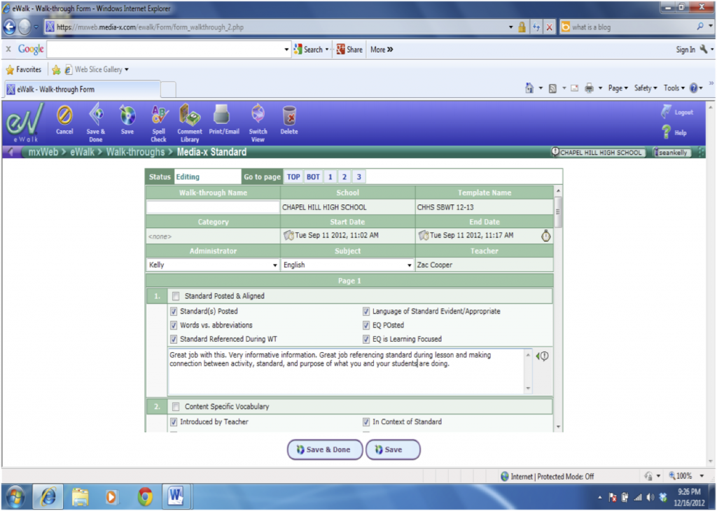 An example of a completed walk-through that I use to provide feedback to my staff.